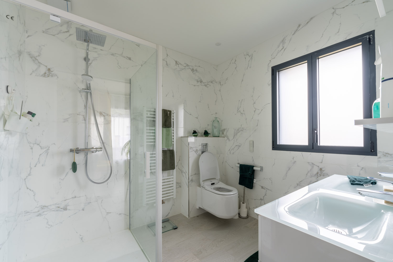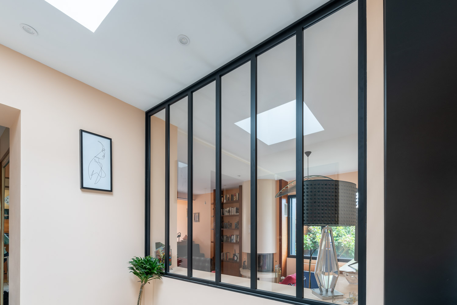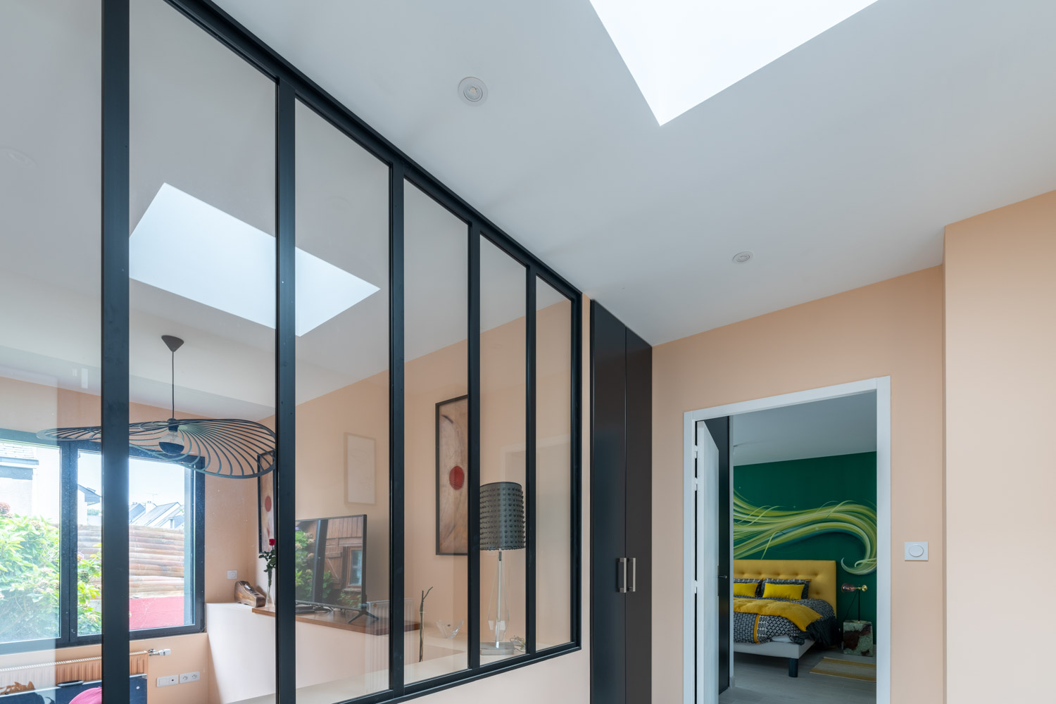 – Organiser un Hall d’accès commun baigné d’apport de lumière naturelle apportée à la fois par les ouvertures créées au sud et depuis le toit avec une verrière permettant des vues depuis le salon-séjour.