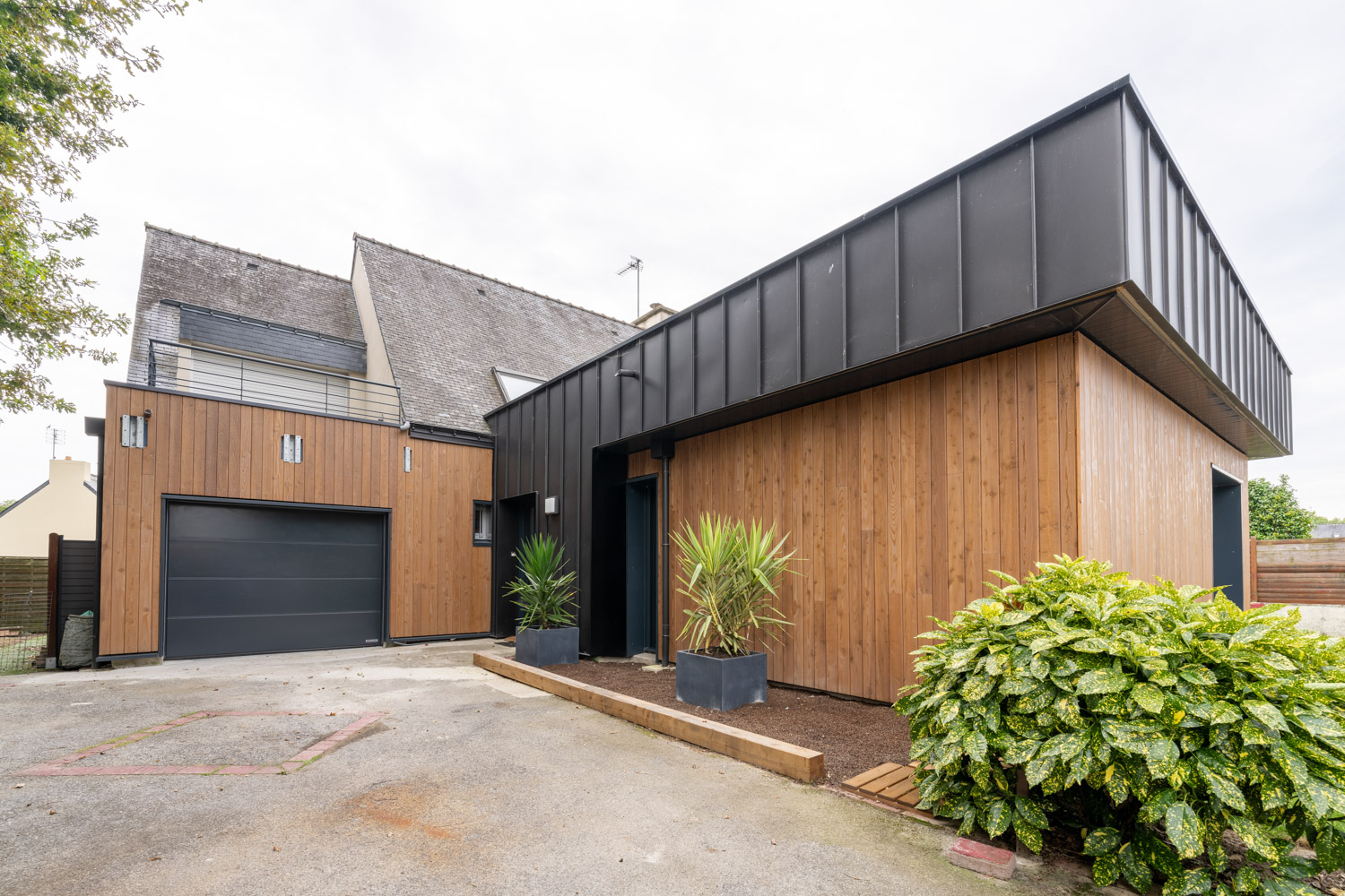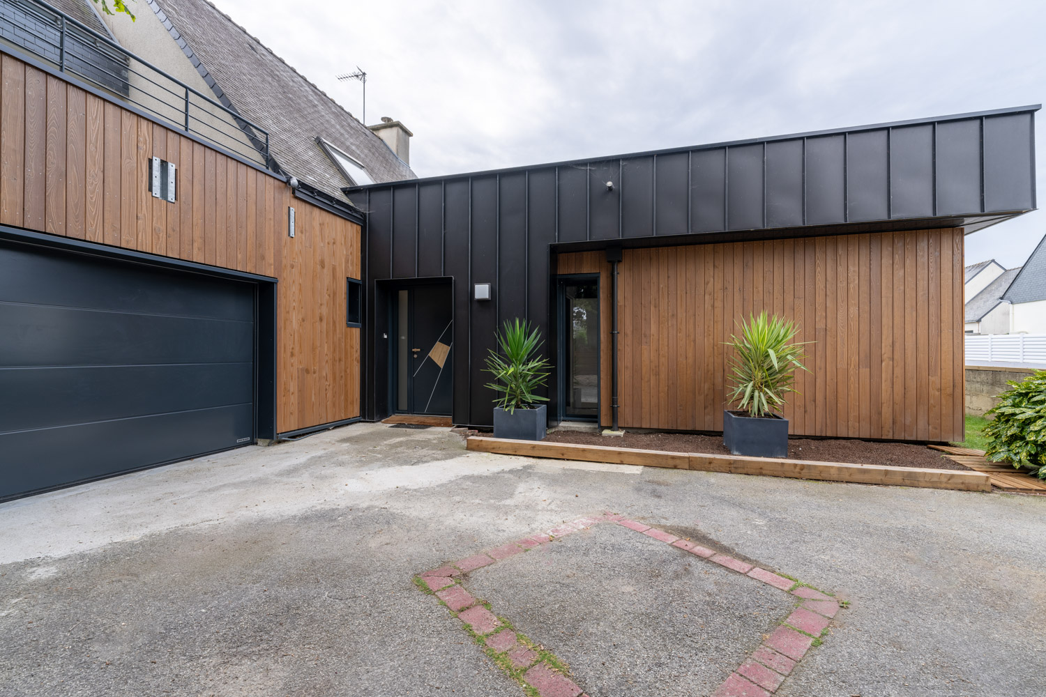 – L’utilisation de matériaux tels que le bois pour créer une continuité de façade en contraste avec le zinc marquant l’entrée et soulignant la coiffe du toit pour une architecture harmonieuse et épurée.